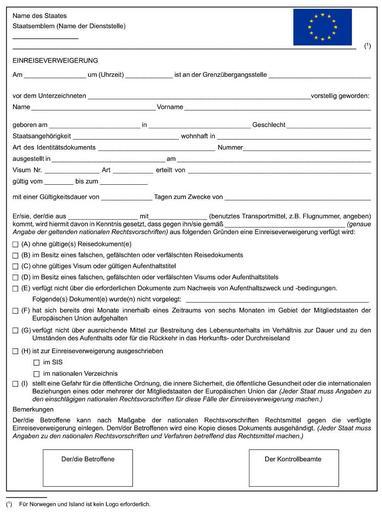 | Keywords: Grenzkodex-einreiseverweigerung.jpg  en Standard form for refusal of entry at the Schengen external border according to Annex V of the Regulation EC No 562/2006 of 15 March 2006 OJ L 105 13 04 2006 p 23 de Standardformular für die Einreiseverweigerung an einer Schengen-Außengrenze nach Anhang V der Verordnung EG Nr 562/2006 vom 15 März 2006 ABl Nr 105 vom 13 April 2006 S 23 http //eur-lex europa eu/LexUriServ/LexUriServ do uri OJ L 2006 105 0001 0032 DE PDF © Europäische Union http //eur-lex europa eu Verbindlich ist ausschließlich das in den gedruckten Ausgaben des Amtsblattes der Europäischen Union veröffentlichte Gemeinschaftsrecht 2006-04-13 http //eur-lex europa eu/de/editorial/legal_notice htm PD-EUGov Schengen Agreement |