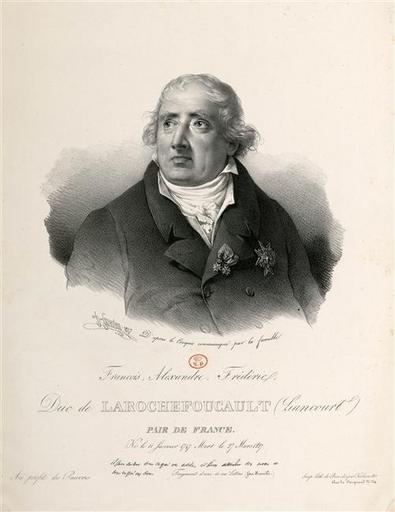 Keywords: Grevedon - François-Alexandre-Frédéric, duc de la Rochefoucauld-Liancourt, économiste (1747-1837).jpg François-Alexandre-Frédéric duc de la Rochefoucauld-Liancourt économiste 1747-1837 lithographie m 0 432 0 330 Versailles Institution Versailles député de la noblesse aux Etats-Généraux de 1789 par le bailliage de Clermont-en-Beauvoisis- Son mot au roi le 12 juillet 1789 est bien connu « Mais c'est donc une révolte » s'écriait Louis XVI effrayé de l'agitation du peuple - « Non sire fit gravement le duc ; c'est une révolution » sous la Restauration Inspecteur général de l'Ecole des arts et métiers fonda la première caisse d'épargne de France et académicien des Sciences François-Séraphin Delpech éditeur L'identification du modèle est celle établie du temps de Louis-Philippe http //www photo rmn fr/cf/htm/CSearchZ aspx o Total 87 FP 29441144 E 2K1KTSGU4V7NU SID 2K1KTSGU4V7NU New T Pic 31 SubE 2CWBF11KMAW century 19 Other versions PD-Art PD-old files by User Jimmy from fr wikipedia François Alexandre Frédéric de La Rochefoucauld-Liancourt Images from Réunion des musées nationaux |