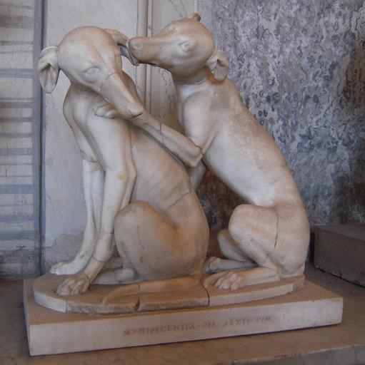 | Keywords: Greyhounds playing, Vatican.jpg Group of greyhounds playing 2nd C BCE marble Museum musei Vaticani Museo Pio-Clementino Sala degli Animali An almost identical statue found at the same time and place is in the British Museum part of the Townley Collection object history from Monte Cagnolo near Lanuvio discovered 1774 accession number Inv 430 PD-old-100-1923 Photo Henry Townsend Museo Pio-Clementino - Sala degli animali Ancient Roman statues in the Vatican Museums Animals 2nd-century statues in the Vatican Museums Dogs in ancient Roman art Greyhounds in art in antiquity Sculptures of greyhounds Greyhounds in art alone Townley Collection Statues of animals in Rome dog |