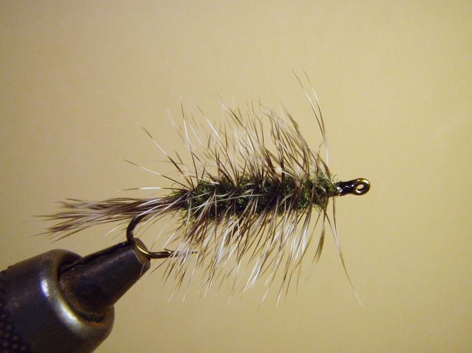 Keywords: GrizzlyAndOliveWoollyWorm.jpg Gizzly and Olive Woolly Worm Wet Fly Own 2008-03 Mike Cline Wet fly patterns