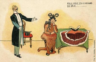 | Keywords: 'k Heb een nichtje, ze heet Adel, 'n Aardig lief meisje, je kent haar wel, 'n Beetje scheel, maar dat hindert niet, Verlief wordt ge daadlijk als g' haar ziet. 'k Zou met haar naar de kermis gaan, Doch deez' grap kwam mij duur te staan, Ach, sprak Adele, 'k durf haast niet, Als men mijn oogen ziet. Adele, Adele, Niemand die op je oogen let, Wij klinken, wij drinken, Met kermis heeft iedereen pret. Zoo gingen wij naar den schouwburg nu heen, Adele was echter vlug ter been. Ze had wel twee beenen, maar wat een kruis, 't Een was van hout en 't and're niet pluis, Eensklaps daar raakten wij in het gedrang Ze fluisterde, Willem, ik word toch zoo bang, Mijn been dat zit los, ik raak het haast kwijt, Ik troostte de aardige meid: Adele, Adele, Niemand die op je beenen let, Wij klinken, wij drinken, Met kermis heeft iedereen pret. Eindelijk kwamen wij in de zaal, Maar lieve Hemel, wat een schandaal, De leuning der loge was veel te laag, Adele haar bochel schoot in de kraag. Zij kon onmogelijk zitten gaan. Engel, dan moet je maar blijven staan, Ach, zuchtte zij, Willem, nooit doe ik het weer, Ik schaam mij, ik schaam mij zoo zeer. Adele, Adele, Niemand die op je bochel let, Wij klinken, wij drinken, Met kermis heeft iedereen pret. Zoo stond nu Adele slechts een korte poos, 'n Heer achter haar werd verschrikkelijk boos, Niets kon hij zien door Adele haar schuld, Nijdig riep hij: pak je weg met je bult. 'k Wierp m' op den kerel, dat was toch mijn plicht Adele werd woedend, vloog m' ook in 't gezicht, Daar verloor zij haar kapsel en stand een, twee, drie Met 'n hoofdje zoo kaal als m'n knie. Adele, Adele, Niemand die op je haaren let, Wij klinken, wij drinken, Met kermis heeft iedereen pret. Het slot van de zaak dat begrijpt u alras 'n Agent van politie kwam juist van pas, Die nam ons beiden mee naar 't bureau, Adele geboeid en ik evenzoo. Met een been, zonder haar, 't was een treurig gezicht, Nee, zoo'n kermis vergeet ik niet licht, Maar toch verloor ik mijn vroolijkheid niet, En 'k zong als refrein van mijn lied: Adele, Adele, Niemand die op je schoonheid let, Wij klinken, wij drinken, Met kermis heeft iedereen pret. 'k Heb een nichtje, ze heet Adel, 'n Aardig lief meisje, je kent haar wel, 'n Beetje scheel, maar dat hindert niet, Verlief wordt ge daadlijk als g' haar ziet. 'k Zou met haar naar de kermis gaan, Doch deez' grap kwam mij duur te staan, Ach, sprak Adele, 'k durf haast niet, Als men mijn oogen ziet. Adele, Adele, Niemand die op je oogen let, Wij klinken, wij drinken, Met kermis heeft iedereen pret. Zoo gingen wij naar den schouwburg nu heen, Adele was echter vlug ter been. Ze had wel twee beenen, maar wat een kruis, 't Een was van hout en 't and're niet pluis, Eensklaps daar raakten wij in het gedrang Ze fluisterde, Willem, ik word toch zoo bang, Mijn been dat zit los, ik raak het haast kwijt, Ik troostte de aardige meid: Adele, Adele, Niemand die op je beenen let, Wij klinken, wij drinken, Met kermis heeft iedereen pret. Eindelijk kwamen wij in de zaal, Maar lieve Hemel, wat een schandaal, De leuning der loge was veel te laag, Adele haar bochel schoot in de kraag. Zij kon onmogelijk zitten gaan. Engel, dan moet je maar blijven staan, Ach, zuchtte zij, Willem, nooit doe ik het weer, Ik schaam mij, ik schaam mij zoo zeer. Adele, Adele, Niemand die op je bochel let, Wij klinken, wij drinken, Met kermis heeft iedereen pret. Zoo stond nu Adele slechts een korte poos, 'n Heer achter haar werd verschrikkelijk boos, Niets kon hij zien door Adele haar schuld, Nijdig riep hij: pak je weg met je bult. 'k Wierp m' op den kerel, dat was toch mijn plicht Adele werd woedend, vloog m' ook in 't gezicht, Daar verloor zij haar kapsel en stand een, twee, drie Met 'n hoofdje zoo kaal als m'n knie. Adele, Adele, Niemand die op je haaren let, Wij klinken, wij drinken, Met kermis heeft iedereen pret. Het slot van de zaak dat begrijpt u alras 'n Agent van politie kwam juist van pas, Die nam ons beiden mee naar 't bureau, Adele geboeid en ik evenzoo. Met een been, zonder haar, 't was een treurig gezicht, Nee, zoo'n kermis vergeet ik niet licht, Maar toch verloor ik mijn vroolijkheid niet, En 'k zong als refrein van mijn lied: Adele, Adele, Niemand die op je schoonheid let, Wij klinken, wij drinken, Met kermis heeft iedereen pret. |