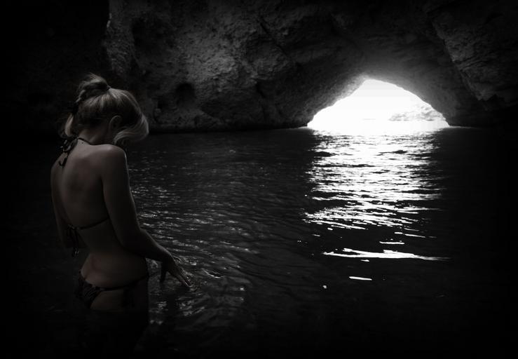 Keywords: grotto ocean cave water rock landscape woman female bikini standing profile black and white scenic outdoors coast limestone geology coastal fashion model sea pose portrait glamour elegance