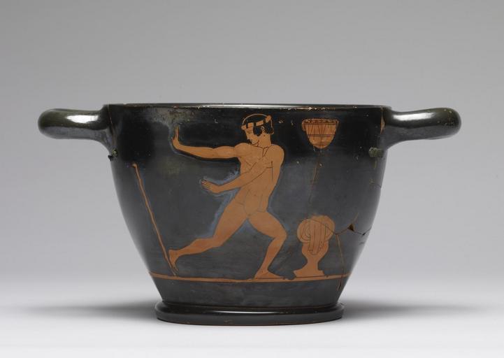 | Keywords: Group of Ferrara T981 - Red-Figure "Skyphos" with Dancer and "Komast" - Walters 482121 - Side A.jpg This skyphos a large drinking cup depicts a dancer and a komast a drunken reveler The dancer lunges to the right with extended arms while the komast stands in profile holding a skyphos These scenes of festivity are fitting for this vessel which was associated with the symposium men's drinking party This particular piece bears evidence of ancient repairs several copper-alloy clamps-some now broken-were used to join the pieces of the damaged vessel indicating the value of the skyphos to the owner even after it had lost its function of holding liquid ca 475 450 BC Classical terracotta copper alloy cm 13 9 27 5 with handles; Diam at mout cm 18 7 ; Diam at foot cm 12 1 accession number 48 2121 29016 Sale XVI Basel June 30 1956 no 132 Paul I Ilton date and mode of acquisition unknown The Paul I Ilton Collection Sale Hans M F Schulman New York November 21 1959 no 637 Walters Art Msueum 1959 by purchase Museum purchase with funds provided by the S and A P Fund 1959 inscription place of origin Attica Greece Walters Art Museum license Ancient Greek red-figure pottery in the Walters Art Museum Media contributed by the Walters Art Museum needs category review Group of Ferrara T981 Media contributed by the Walters Art Museum needs artist update Dance in ancient Greek pottery Komos scenes |