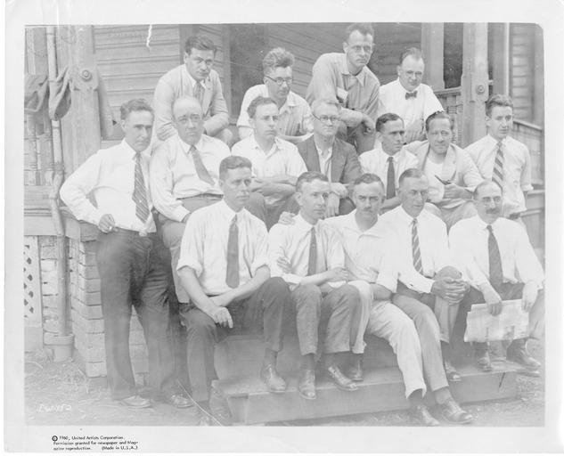 | Keywords: smithsonian institution archives smithsonianinstitutionarchives smithsonian institution smithsonianinstitution heroes blackandwhite monochrome black and white Local number: SIA Acc. 97-020 [SIA2007-0119] Summary: Standing at left: John R. Neal. Standing at right: W.E. Wheelock. In back row (left to right): E. Haldeman-Julius, George Washington Rappleyea, Frank Thone, and Watson Davis. Middle row (left to right): Maynard Mayo Metcalf, Charles Francis Potter, Mr. McCleskey, William Allison Kepner, and Arthur Garfield Hays. Front row (left to right): Wilbur Armstrong Nelson, Fay-Cooper Cole, Winterton Conway Curtis, Horatio Hackett Newman, and Jacob Goodale Lipman. Lawyers, scientists, and supporters of John T. Scopes, assembled on the steps of “Defense Mansion” outside Dayton, Tennessee, July 1925. Standing at left is Judge John R. Neal, the Knoxville, Tennessee, attorney who represented Scopes; standing at right is Neal's brother-in-law, W.E. Wheelock, superintendent of the Southern Pacific Railroad Terminal in Chattanooga. In back row are Kansas publisher E. Haldeman-Julius, Dayton businessman George Washington Rappleyea, and Science Service journalists Frank Thone and Watson Davis. In the middle row are biologist Maynard Mayo Metcalf, theologian Charles Francis Potter, defense court stenographer Mr. McCleskey, biologist William Allison Kepner, and Scopes defense attorney Arthur Garfield Hays. In the front row are Wilbur Armstrong Nelson, anthropologist Fay-Cooper Cole, biologist Winterton Conway Curtis, Horatio Hackett Newman, and Jacob Goodale Lipman. Repository:Smithsonian Institution Archives View more collections from the Smithsonian Institution. Local number: SIA Acc. 97-020 [SIA2007-0119] Summary: Standing at left: John R. Neal. Standing at right: W.E. Wheelock. In back row (left to right): E. Haldeman-Julius, George Washington Rappleyea, Frank Thone, and Watson Davis. Middle row (left to right): Maynard Mayo Metcalf, Charles Francis Potter, Mr. McCleskey, William Allison Kepner, and Arthur Garfield Hays. Front row (left to right): Wilbur Armstrong Nelson, Fay-Cooper Cole, Winterton Conway Curtis, Horatio Hackett Newman, and Jacob Goodale Lipman. Lawyers, scientists, and supporters of John T. Scopes, assembled on the steps of “Defense Mansion” outside Dayton, Tennessee, July 1925. Standing at left is Judge John R. Neal, the Knoxville, Tennessee, attorney who represented Scopes; standing at right is Neal's brother-in-law, W.E. Wheelock, superintendent of the Southern Pacific Railroad Terminal in Chattanooga. In back row are Kansas publisher E. Haldeman-Julius, Dayton businessman George Washington Rappleyea, and Science Service journalists Frank Thone and Watson Davis. In the middle row are biologist Maynard Mayo Metcalf, theologian Charles Francis Potter, defense court stenographer Mr. McCleskey, biologist William Allison Kepner, and Scopes defense attorney Arthur Garfield Hays. In the front row are Wilbur Armstrong Nelson, anthropologist Fay-Cooper Cole, biologist Winterton Conway Curtis, Horatio Hackett Newman, and Jacob Goodale Lipman. Repository:Smithsonian Institution Archives View more collections from the Smithsonian Institution. |