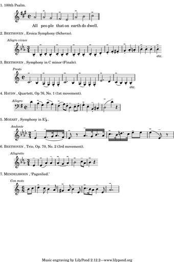 Keywords: Grove 1900 p12.png en Dictionary of Music Musicians edited by Grove 1900 Vol 1 p12 For the article ACCENT Book is on Wikisource Created in Lilypond 2 12 2 from music in Grove's Dictionary 1900 p12 User Beeswaxcandle 2009-07-19 <pre> Grove 1900 Vol 1 p 12 ACCENT \version 2 12 2-1 \markup 1 100th Psalm << \relative c \clef treble \key a \major \time 2/2 \partial 2 1 a2 a \markup \bold gis fis \markup \bold e a \markup \bold b cis \markup \bold \bar \addlyrics All peo -- ple that on earth do dwell >> \markup 2 \smallCaps Beethoven Eroica Symphony Scherzo \relative c' \clef treble \key ees \major \time 3/4 \override Score RehearsalMark 'break-align-symbol 'time-signature \mark \markup \small \italic Allegro vivace \partial 4 1 bes4- bes- \markup \bold c- bes- c- \markup \bold bes- c- bes- \markup \bold c- bes- c- \markup \bold bes- d- ees- \markup \bold f- fis- g- \markup \bold aes- a- bes- \markup \bold bes- bes- bes- \markup \bold -\markup etc \markup 3 \smallCaps Beethoven Symphony in C minor Finale \relative c' \clef treble \key c \major \time 2/2 \override Score RehearsalMark 'break-align-symbol 'time-signature \mark \markup \small \italic Presto c2 \markup \bold b4 a \markup \bold g g- g- c2 \markup \bold b4 a \markup \bold g g- g- e'2 \markup \bold d4 c \markup \bold b b- b- -\markup etc \markup 4 \smallCaps Haydn Quartett Op 76 No 1 1st movement \relative c' \clef bass \key g \major \time 2/2 \override Score RehearsalMark 'break-align-symbol 'time-signature \mark \markup \small \italic Allegro \partial 4 1 d4 b \markup \bold g c \markup a fis \markup \bold a8 fis- d4 \markup e8- fis- g4- \markup \bold e- b- \markup cis- d2 \markup \bold d'4 \markup r4 \markup 5 \smallCaps Mozart Symphony in E\flat \relative c' \clef treble \key aes \major \time 2/4 \override Score RehearsalMark 'break-align-symbol 'time-signature \mark \markup \small \italic Andante ees4 \markup \bold f16 \markup g32 aes16 f32 ees8 \markup \bold r8 aes16 \markup g32 bes16 aes32 c16 \markup \bold bes32 d16 c32 ees8 \markup ees ees4 \markup \bold ees 8 \markup r8 \markup 6 \smallCaps Beethoven Trio Op 70 No 2 3rd movement \relative c' \clef treble \key ees \major \time 3/4 \override Score RehearsalMark 'break-align-symbol 'time-signature \mark \markup \small \italic Allegretto \partial 4 1 ees4 \markup ees \markup \bold aes aes \markup aes \markup \bold g aes \markup \bold bes2 \markup \bold c8 \markup aes bes4 \markup \bold r4 \markup 7 \smallCaps Mendelssohn Pagenlied \relative c \clef treble \key c \major \time 6/8 \override Score RehearsalMark 'break-align-symbol 'time-signature \mark \markup \small \italic Con moto \partial 8 2 b8 c d4 \markup \bold c8 b4 \markup a8 gis4 \markup \bold a8 b4 \markup e 8 c'8 \markup \bold b16 a8 b4 \markup e 8 a2 \markup \bold </pre> Dictionary of Music and Musicians 1900 Lilypond images Uncategorized 2015 January 2 |