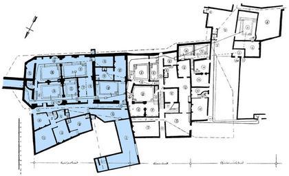 Keywords: Grundriss oberer Badehauskomplex Aachen.jpg Grundriss des oberen Badehauskomplexes in Aachen bestehend aus Kaiserbad blau eingefärbt Kleinbad und Quirinusbad Oberstadtdirektor der Stadt Aachen Ed Bad Aachen seine Quellen und das Kaiserbad Aachen Kutsch ca 1964 p 12 1677 Adam Winants PD-old-100 Kaiserbad |