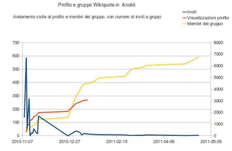Keywords: Gruppo Wikiquote di aNobii, andamento membri.png it Grafico del numero di visualizzazioni del profilo e di iscritti al gruppo di Wikiquote in italiano in aNobii correlati al numero di inviti In ordinata a sinistra inviti e visualizzazioni totali a destra gli inviti di quel giorno Fino al 12 novembre 2010 sono incluse migliaia di inviti a gruppi diversi da quello su Wikiquote da parte dell'utenza Wikiquote mentre in seguito gli inviti sono stati inviati prevalentemente da un'altra utenza own Nemo bis 2011-02-24 Cc-zero Wikiquote statistics Wikimedia Italia |