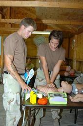 Keywords: GTMO Troopers Unite During CLS Training DVIDS205721.jpg en Army Pvt Peter Sutton assigned to Joint Task Force Guantanamo's Joint Detention Group practices a venipuncture on a medical model as Army Spc Sasha Sanders observes his technique during combat lifesaver training Sept 10 Service members from JTF Guantanamo participate in the CLS training to maintain first aid techniques for mission readiness JTF Guantanamo conducts safe humane legal and transparent care and custody of detainees including those convicted by military commission and those ordered released by a court The JTF conducts intelligence collection analysis and dissemination for the protection of detainees and personnel working in JTF Guantanamo facilities and in support of the War on Terror JTF Guantanamo provides support to the Office of Military Commissions to law enforcement and to war crimes investigations The JTF conducts planning for and on order responds to Caribbean mass migration operations 2009-09-10 Petty Officer 1st Class Katherine Hofman https //www dvidshub net/image/205721 090910-N-+++++-035 2009-09-21 16 02 GUANTANAMO BAY CU PD-USGov-Military-Navy Joint Task Force Guantanamo Guantanamo Bay Images from DoD uploaded by Fæ |