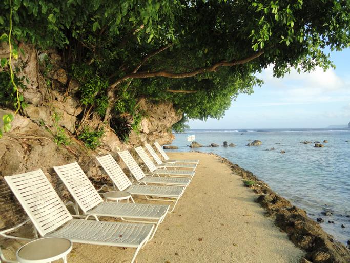 Keywords: guam beach sea ocean water trees chairs lounges chaise nature outside tropics tropical