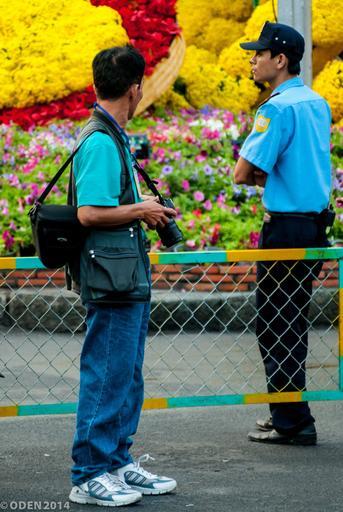 Keywords: guard photographer flowers yellow red street outside saigon city