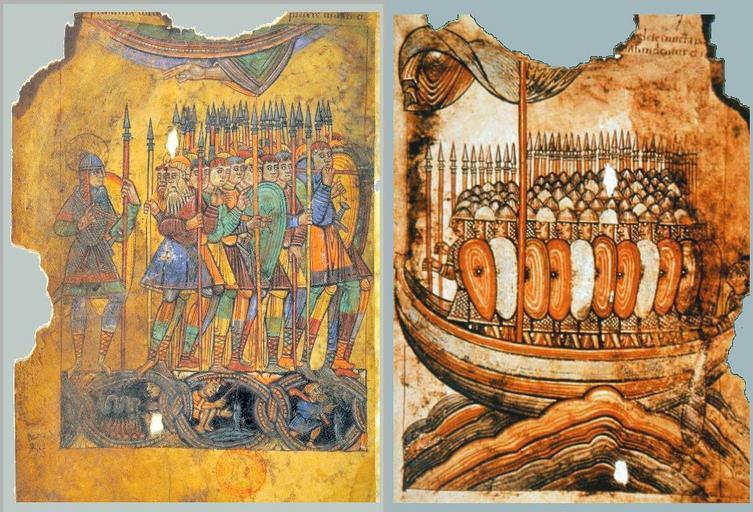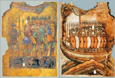 Keywords: Guerande-vikings-1.jpg folio 7v s aubin défendant guérande folio 7r flotte normande Life of Saint Aubin / Miracula Sancti Albini / Vie de Saint Aubin created in the XIe - From abbaye de Angers France - BNF unknown - died before 1200 all - public domain 0 PD-old knots in art and decoration Guérande Normans Miracula Sancti Albini Viking ships in art Vikings in art |