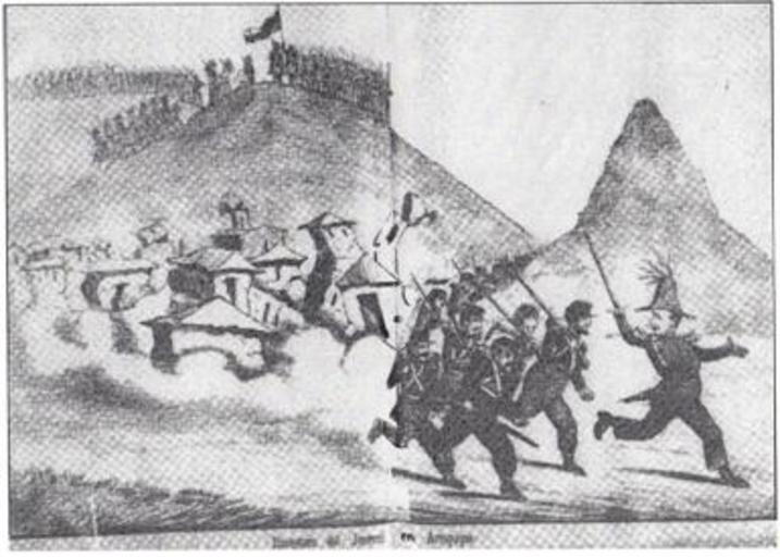 Keywords: Guerra del pacÃfico 1879-1884 Caricatura 40.jpg en Patricio Ibarra Cifuentes escribe Con objeto de neutralizar las tropas y montoneras peruanas que operaban al interior del Perú poniendo en riesgo el establecimiento del gobierno del general peruano Miguel Iglesias las autoridades chilenas determinaron la necesidad de realizar una expedición militar sobre Arequipa y sus alrededores sede del autoproclamado gobierno del almirante Lizardo Montero En octubre de 1883 la expedición al mando del coronel José Velásquez acometió con la empresa y logró ocupar Arequipa hacia fines de mes El Padre Cobos publicó esta caricatura el dÃa 6 de octubre de 1883 en la cual se muestra a las fuerzas peruanas arequipeñas huyendo ante la sola presencia del General Pililo personaje idealizado representante del soldado chileno y sÃmil del roto vencedor de la batalla de Yungay en 1839 en esa oportunidad durante las campañas contra la Confederación Perú “ boliviana 1881 http //www tesis uchile cl/tesis/uchile/2009/ibarra_pa/html/index-frames html Caricaturas chilenas de la Guerra del PacÃfico 1879-1884 La presente monografÃa presenta un análisis e interpretación de 105 caricaturas publicadas en periódicos humorÃsticos chilenos inspiradas en las causas desarrollo y consecuencias de la Guerra del PacÃfico enfrentamiento armado que Chile llevó adelante contra la alianza formada por Perú y Bolivia durante los años 1879 y 1884 Divididos en seis categorÃas temáticas los grabados seleccionados muestran como los editores de los rotativos y sus dibujantes señalaron su particular punto de vista aportando con ello a la discusión pública emanada desde la prensa a propósito del conflicto del norte Asimismo se presenta un sucinto estudio de los diarios de sátira que vieron la luz mientras se llevaban a cabo las hostilidades caracterizándolos y ubicándolos a partir de la posición que ocuparon en el espectro polÃtico de la época http //www tesis uchile cl/tesis/uchile/2009/ibarra_pa/html/index-frames html http //www repositorio uchile cl/handle/2250/108555 Compiladas por Ibarra Cifuentes Patricio other versions PD-Art Chilean Caricatures in the War of the Pacific |