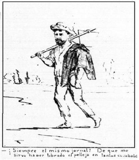 Keywords: Guerra del pacífico 1879-1884 Caricatura 93.jpg es Patricio Ibarra Cifuentes escribió A casi dos meses de la entrada de las tropas chilenas a Lima El Corvo en su edición del 12 de marzo de 1881 mostró a un veterano de vuelta a su trabajo agrícola luego de ser desmovilizado del Ejército Este hombre se queja amargamente respecto de sus bajos ingresos pese a haber servido y librado sin rasguño en la campaña al Perú Una vez en Chile los ex-combatientes al reinsertarse en la sociedad debieron afrontar las mismas dificultades económicas que las padecidas antes de la guerra pese a contar con una gratificación equivalente a tres meses de sueldo la cual les otorgó cierta tranquilidad mientras lograban encontrar una nueva ocupación 1879-1884 http //www tesis uchile cl/tesis/uchile/2009/ibarra_pa/html/TH 4 html Chilean magazines El Ferrocarrilito El Padre Cobos El Diablo José Peluca El Barbero El Corvo Padre Padilla Diógenes other versions PD-old-70-1923 Chilean Caricatures in the War of the Pacific |