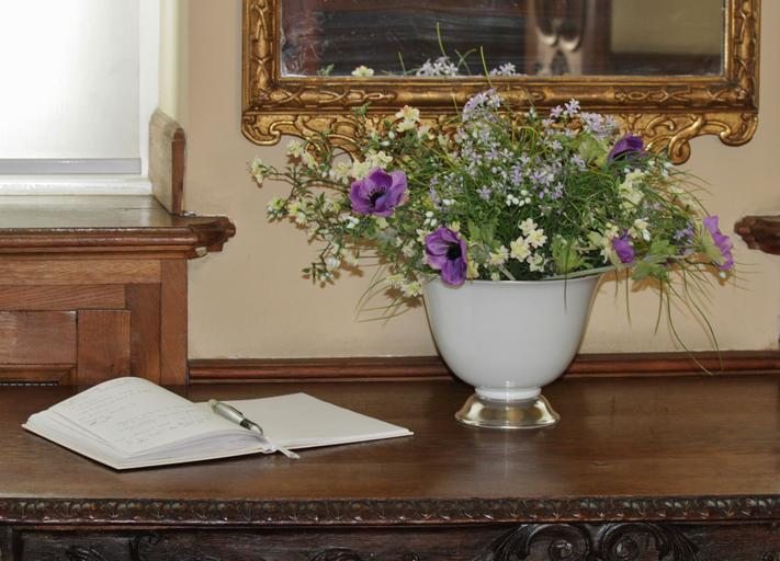 Keywords: guestbook guest book entry bouquet of flowers still life antique decor flowers deco decoration mirror mirror frame table decorations bouquet floral book pen vase flower vase table antiques blossom bloom decorative