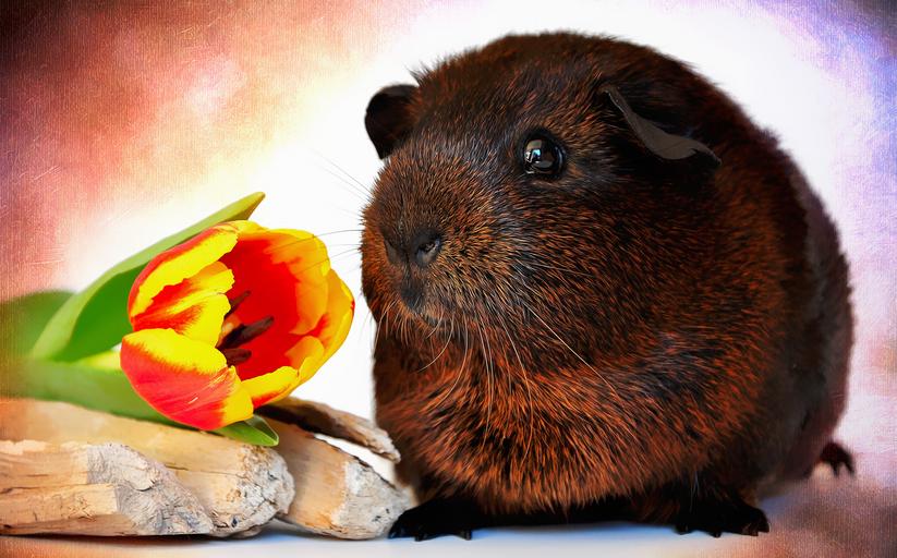 Keywords: guinea pig smooth hair gold agouti pet rodent nager animal portrait tulip flower blossom bloom small animal close painting digital painting