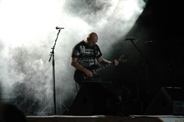 Keywords: guitar bass music rock scene musical instrument electric concert band black spot silhouette live entertainment play performance guitarist player melody rocker performer person stage