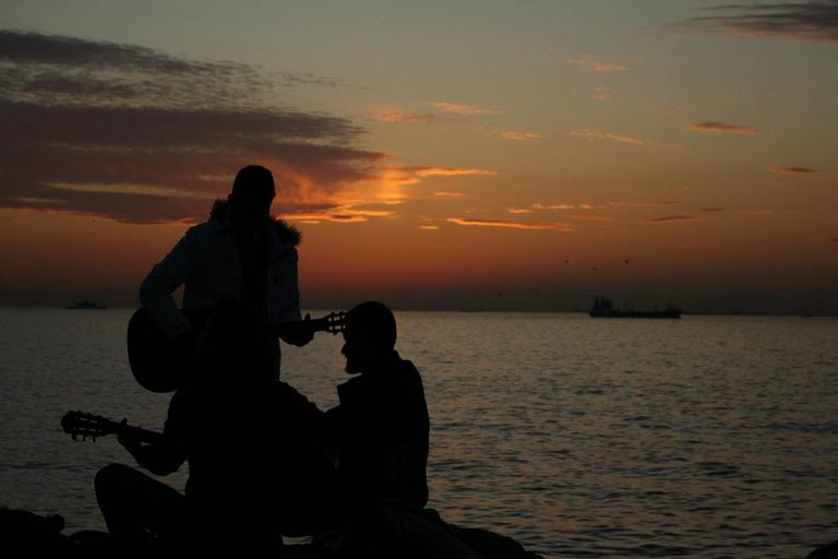 Keywords: guitar musician dawn music sea acoustic guitarist man silhouette