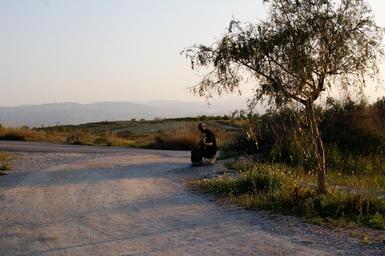 Keywords: guitar sunset field man plaing guitar the road path only along the road