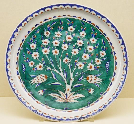 | Keywords: Gulbenkian-Prunus blossom tree.jpg Shallow dish with a flanged rim decorated with prunus tree blossom reserved in white against a green ground c 1585 place of creation Iznik Turkey Fritware/stonepaste decorated under a clear glaze Diameter 34 cm height 4 cm Institution Calouste Gulbenkian Museum citation Queiroz Ribeiro Maria 2009 Iznik pottery and tiles in the Calouste Gulbenkian collection Calouste Gulbenkian Foundation Lisbon 978-972-8848-58-3 67 Fig 33 citation Atasoy Nurhan Raby Julian 1989 Iznik The Pottery of Ottoman Turkey Alexandra Press London 978-1-85669-054-6 250-251 fig 504 object history Acquired in 1919 credit line accession number 787 own photo date 27 August 2009 Xauxa artwork license PD-old-100 photo license cc-by-sa-3 0 GFDL other versions İznik ceramics in the Calouste Gulbenkian Museum |