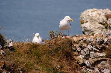 Keywords: gull breed pair two high above nest blue sea coast rock vigilant bird nature summer sky blue birds fly plumage lake