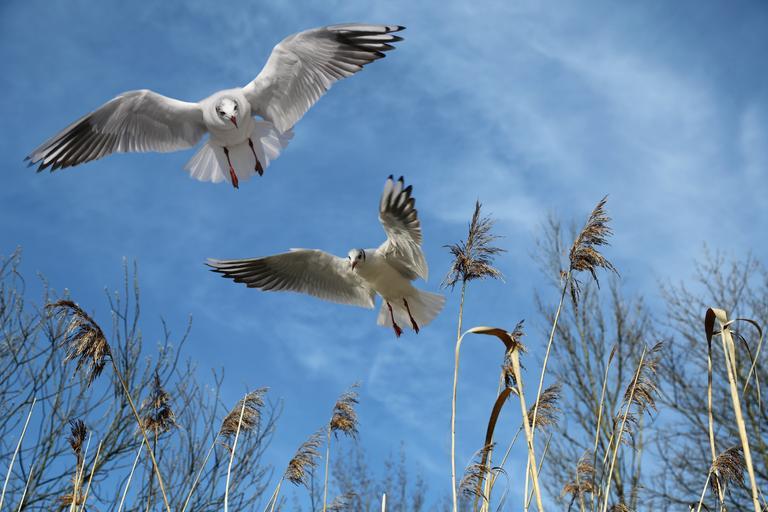 Keywords: gulls fly bird sky wing freedom locomotion feather plumage air flight form water bird animal spring dress nature creature bill cloudiness reed clouds föhn clouds blue marsh plant plant teichplanze summer grasses
