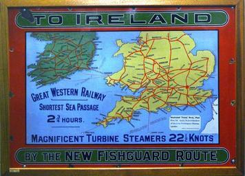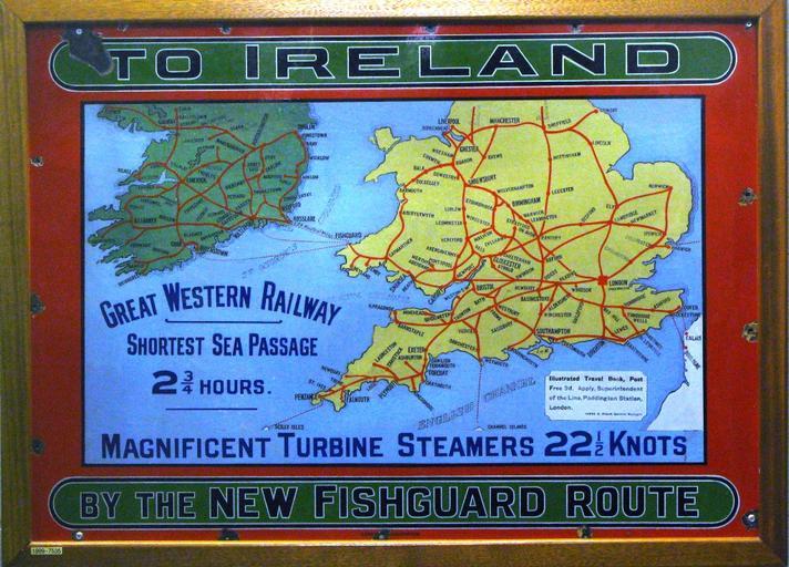 | Keywords: GWR Fishguard route enamel sign.jpg en An enamel advertising sign for the Great Western Railway's shipping services from Fishguard Wales to Ireland It is on display at the National Railway Museum York England Photograph of an old advertisement sign Author ca 1908 Photographs by Geof Sheppard Great Western Railway Shipping companies of the United Kingdom Enamel signs PD-Art Enamel billboards | ||||