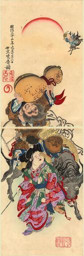 Keywords: Gyosai Daikoku.jpg Kyosai Daikoku 2 January 1889 Diptych 9 by 28 The print depicts three of the Gods of Good Fortune Daikoku rides an ox led by Otafuku and Hotei appears in the sky From http //www japaneseprints net/viewitem cfm ID 2147 here PD-Art Nishiki-e in Meiji period Kawanabe Kyosai Paintings on scrolls from Japan Oxen in art Paintings of Hotei Daikokuten Ame-no-Uzume-no-Mikoto Artworks missing infobox template