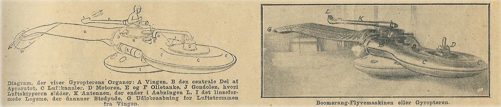 Keywords: Gyrocopter by Papin and Rouilly 1914.jpg Plan of Gyropter invented by Papin and Rouilly from France from Danish magazine Illustreret Familiejournal Illustrated Familyjournal 1914 no 44 p 29 The caption reads Diagram showing the parts of the gyropter A The wing B The central part of the machine C Airchannels D The motor E F The oiltank J The gondola wherein the aircaptain sits K The antenna that ends in the opening L I the lenseshaped body that creates a cushion G Emitteropening for the airstream from the wing The caption on the second picture reads The boomerang flying machine or the gyropter Illustreret Familiejournal 1914 Users reproduction of an expired work of art PD-Art Monocopter 1910s diagrams Inventions Hovercraft in art |