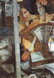 | Keywords: Gyula Derkovits, fish seller, 1930.jpg  Artwork creator Gyula Derkovits 1930 LangSwitch Oil and gold-silver powder paint on paper Olaj arany-ezüst porfesték papíron size cm 80 35 5 Institution Hungarian National Gallery accession number object history credit line Fine Arts in Hungary http //www hung-art hu/kep/d/derkovit/muvek/2/derko202 jpg http //www hung-art hu/frames-e html /english/d/derkovit/muvek/2/index html PD-old-70 Paintings by Gyula Derkovits in the Hungarian National Gallery Paintings of fish Merchants in art 1930 paintings in Hungary |