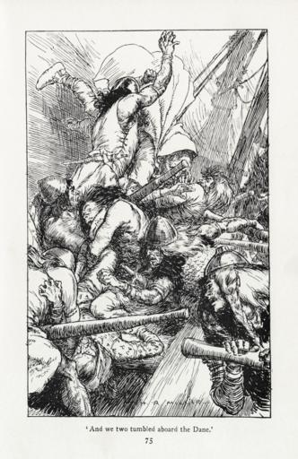 Keywords: H. R. Millar - Rudyard Kipling - Puck of Pook's Hill 6.png H R Millar's 6th illustration to the original edition of Rudyard Kipling's Puck of Pook's Hill from the chapter The Knights of the Joyous Venture 'And we two tumbled aboard the Dane' Note While not as far from right angles as 4 in the set this still isn't very rectangular It would be misleading to fix 1906 Harold Robert Millar Puck of Pook's Hill First reprint October 1906 London Macmillan and Co Limited 1906 Harold Robert Millar 1869-1940 Restoration by Adam Cuerden PD-old-70-1923 For other images from the book see Category Puck of Pook's Hill File H R Millar - Rudyard Kipling - Puck of Pook's Hill 6 jpg - Restoration JPEG File H R Millar - Rudyard Kipling - Puck of Pook's Hill 6 png - Restoration PNG File Original Scan - H R Millar - Rudyard Kipling - Puck of Pook's Hill 6 tif - Original scan TIFF DEFAULTSORT Puck of Pook's Hill 006P Puck of Pook's Hill Adam Cuerden's restorations |