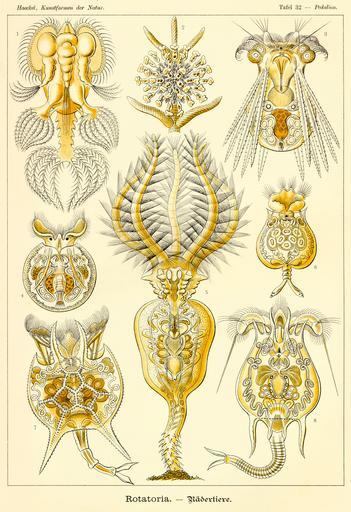 Keywords: Haeckel Rotatoria.jpg top left Pedalion mirum <small> Hudson </small> Hexarthra mira <small> Hudson 1871 </small> from above top center Lacinularia socialis <small> Ehrenberg </small> Lacinularia flosculosa <small> O F Muller 1773 </small> group of individuals on water plant top right Polyarthra platyptera <small> Ehrenberg </small> Polyarthra sp from above left Pterodina patina <small> Ehrenberg </small> Testudinella patina <small> Hermann 1783 </small> from above center Stephanoceros Eichhornii <small> Ehrenberg </small> Stephanoceros fimbriatus <small> Goldfuss 1820 </small> from the side right Euchlanis dilatata <small> Leydig </small> Euchlanis dilatata <small>Ehrenberg 1832</small> from above bottom left Noteus Leydigii <small> Haeckel </small> Platyias quadricornis <small> Ehrenberg 1832 </small> from above bottom right Brachionus Bakeri <small> Ehrenberg </small> Brachionus quadridentatus <small>Hermann 1783</small> / Brachionus capsuliflorus <small>Pallas 1766</small> from above Kunstformen der Natur 1904 plate 32 Rotatoria see http //caliban mpiz-koeln mpg de/haeckel/kunstformen/high/Tafel_032_300 html here http //caliban mpiz-koeln mpg de/haeckel/kunstformen/high/Tafel_032_text_1_200 html here and http //caliban mpiz-koeln mpg de/haeckel/kunstformen/high/Tafel_032_text_2_200 html here creator Ernst Haeckel 1904 public domain due to age PD-old Kunstformen der Natur 1904 Hexarthra mira Lacinularia flosculosa Polyarthra Testudinella patina Stephanoceros fimbriatus Euchlanis dilatata Platyias quadricornis Brachionus rotifera |