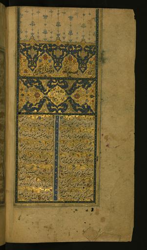 Keywords: Hafiz - Illuminated Incipit Page with Headpiece - Walters W6291B - Full Page.jpg This page from Walters manuscript W 629 has an illuminated headpiece inscribed wa-Llah khayr hafiz The main text is decorated with interlinear illumination with polychrome motifs The vertical divider is illuminated with floral motifs on a blue ground The headpiece and written surface are surrounded by a dark blue band with white crosses and an illuminated frame islamic 1552 958 Safavid ink and pigments on buff and rose-tinted laid paper cm 20 5 12 accession number W 629 1B 81379 Mustafá Pasha Vali-i Iskandariyah prior to 1231 mode of acquisition unknown dated 1231 see fol 1a Hasan Haqqi 1285 mode of acquisition unknown see fol 1a Hasan Haqqi Vali-i Salanik 1303 mode of acquisition unknown see fol 1a Henry Walters Baltimore date and mode of acquisition unknown Walters Art Museum Henry Walters Acquired by Henry Walters place of origin Iran Walters Art Museum license 2D Divan by Hafez Safavid Walters MS 629 |