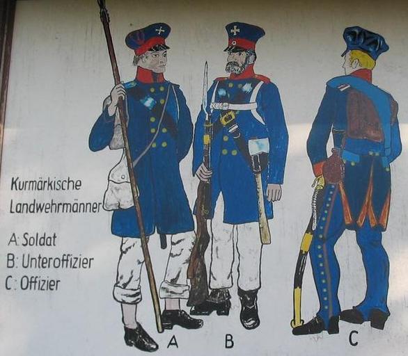 | Keywords: Hagelberg D1 Battle.JPG Kurmärkische Landwehrmänner Schlacht bei Hagelberg 1813 Das Dorf Hagelberg ist ein Ortsteil der Kreisstadt Belzig im Landkreis Potsdam-Mittelmark und liegt im Naturpark Hoher Fläming Zwei Denkmäler erinnern an die Schlacht von 1813 in den Befreiungskriegen und den Sieg preußischer und russischer gegen napoleonische Truppen Prussian žLandwehrmänner militia men Battle nearby Hagelberg 1813 The village Hagelberg is a part of the town Belzig in the district Potsdam Mittelmark federal state of Brandenburg Germany The village appertains to the Nature Park Hoher Fläming Two monuments on Hagelberg hill commemorate the victory of Prussian and Russian troops in the žBattle of Hagelberg in 1813 against Napoleonic forces Foto Ausschnitt einer offiziellen Informationstafel der Naturparkverwaltung Hoher Fläming auf dem Gipfel des Hagelbergs Angaben zur Karte Urheber Datum werden nicht gemacht 12 October 2006 Date of the picture Lienhard Schulz took the picture Public Domain wegen de Panoramafreiheit Lienhard Schulz Military uniforms of Prussia Military peaked caps of Germany Battle of Hagelberg |
