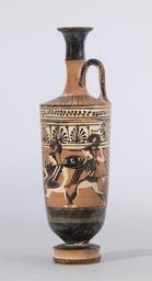 | Keywords: Haimon Painter - Three Amazons and Herakles - Walters 48241 - Right.jpg Herakles is depicted on this black-figure lekythos with his usual attributes the lion skin and the club which he holds in his right hand and a quiver He is facing right grasping an Amazon who tries to escape from him though she turns her head to face him There is an Amazon on each side of this duel One runs away from Herakles while the other runs toward his captive as if coming to her aid All three are similarly dressed; two carry spears; one has no shield Herakles' ninth labor for King Eurytheus required him to retrieve the girdle of the queen of the Amazons While the queen at first willingly acceded to Herakles' request the goddess Hera spread a rumor among the Amazons that Herakles intended to kidnap their queen; when the Amazons attacked him Herakles killed her and made off with her girdle This theme was a common subject on vases depicting the Amazons and one of the most frequently recurring subjects on vases portraying Herakles and his labors In vase-painting the Amazon queen is usually named Andromache she is more often named Hippolyte in the literary evidence and the girdle itself is usually not depicted until after the 6th century ca 525 475 BC terracotta cm 27 8 2 accession number 48 241 27241 Joseph Brummer New York date and mode of acquisition unknown Henry Walters city Baltimore Walters Art Museum Henry Walters Acquired by Henry Walters 1924 Heroes Mortals and Myths in Ancient Greece The Walters Art Museum Baltimore; Frist Center for the Visual Arts Nashville; San Diego Museum Of Art San Diego; Alexander S Onassis Public Benefit Foundation USA New York 2009-2011 place of origin Attica Greece Walters Art Museum license Ancient Greek black-figure pottery in the Walters Art Museum Haimon Painter Media contributed by the Walters Art Museum needs category review Media contributed by the Walters Art Museum needs artist update |