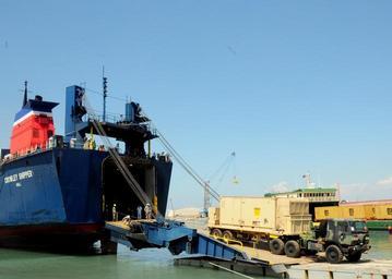 Keywords: Haiti Relief DVIDS253592.jpg en Service members conducting joint logistics over the shore operations at the main seaport in Port-au-Prince Haiti off-load construction vehicles and equipment assigned to the U S Army 7th Sustainment Brigade from the British-flagged Crowley Shipper Several U S and international military and non-governmental agencies are conducting humanitarian and disaster relief operations as part of Operation Unified Response after a 7 0-magnitude earthquake caused severe damage in and around Port-au-Prince Haiti Jan 12 2010-02-19 Petty Officer 2nd Class Kimberly Martinez https //www dvidshub net/image/253592 100220-N-+++++-038 2010-02-23 05 58 PORT-AU-PRINCE HT PD-USGov-Military-Navy Operation Unified Response Images from DoD uploaded by Fæ |