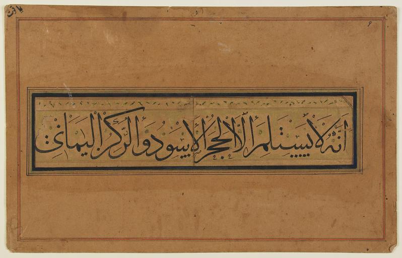 | Keywords: Hajj Directions WDL6835.png Artwork ru Якут аль- устасими уме в 1299 г fr Yaqut al-Mustasimi mort vers 1299 en Yāqūt al-Mustaʻṣimī died 1299 zh 雅谷特·穆塔 密,卒于 1299 年 pt Yāqūt al-Mustaʻṣimī falecido em 1299 ar ياقوت المُستعصمي، توفي 1299؟ es Yāqūt al-Mustaʻṣimī fallecido circa 1299 ru аставления относительно хаджа fr Indications pour le Haj en Hajj Directions zh 指南 pt Instruções para o Hajj ar إرشادات الحج ru В этой надписи гово ится <em> Аннаху ля ясталим иля ль-хаджа аль-асвад уа-ль- укн аль-ямани </em> Он не аз ешает это к оме как у Че ного камня и у Йеменского угла По-видимому данная ст ока является частью уководства для паломников или текста с наставлениями в кото ых гово ится что во в емя <em>тавафа</em> итуального обхода п икасаться к Каабе или целовать ее аз ешается только возле Че ного камня и Йеменского юго-восточного угла екото ые молитвы и п ошения также связаны с этими двумя углами Каабы Данная ст ока текста написана че ными че нилами к упным и четким ш ифтом сулюс В словах указаны все огласовки а буква <em>син</em> с соп овождается т емя точками асположенными ниже ст оки с текстом чтобы ее можно было отличить от буквы <em>шин</em> ш Из ечение написано на бумаге бежевого цвета об амлено облакооб азными полосами и помещено на фон в виде облаков Его ок ужают несколько амок включая го изонтальную полосу с узо ом в фо ме листьев синего цвета Ст аница с из ечением наклеена на более к упный лист светло-ко ичневой бумаги с ка тонной основой а обо отной сто оне ф агмента находится надпись в кото ой авто ом данной ст оки называется известный каллиг аф XIII века Якут аль- устасими уме в 1296 году / в 696 году хидж ы аботавший п и дво е Аббасидов в Багдаде и пе еживший монгольские нашествия Аль- устасими писал шестью укописными стилями включая сулюс использованный в данном ф агменте есмот я на то что данный текст не подписан и возможно был дополнен в более позднее в емя вполне ве оятно что соде жащаяся в нем ст ока была написана самим Якутом аль- устасими <br>А абская каллиг афия; А абские укописи; Хаджи; Иллюмини ование укописей; Исламская каллиг афия; Исламские укописи; Паломники и паломничество fr La ligne de texte est la suivante <em>Annahu la yastalim ila al-hajar al-aswad wa-al-rukn al-yamani</em> Il ne le permet pas sauf à la pierre noire et au coin yéménite Il semble que ce texte constitue un fragment d'un guide de pèlerinage ou d'un texte normatif indiquant que durant le <em>tawaf</em> rituel de circumambulation toucher ou embrasser la Kaaba n'est permis qu'à le pierre noire et au coin yéménite le coin sud-est Certaines prières et supplications sont aussi particulières à ces deux coins de la Kaaba La ligne de texte est exécutée en une écriture thoulouth large et nette à l'encre noire Les mots sont complètement vocalisés et la lettre <em>sin</em> s comporte trois points sous la ligne de texte pour la distinguer de la lettre <em>shin</em> sh Le texte est écrit sur du papier beige encadré par des bandes de nuages et sur fond de nuages Il est doté de plusieurs cadres comprenant une bande horizontale de motifs de feuilles bleues Il est collé sur une feuille plus grande de papier marron clair renforcé par du carton au dos Au verso du fragment apparait une note attribuant le document au célèbre calligraphe du XIII<sup>e</sup> siècle Yaqut al-Mustasimi mort en 696 après l'Hégire/1296 après J -C Actif à la cour abbasside de Bagdad il vécut les invasions mongoles Il écrivait dans les six styles de cursive notamment le thoulouth utilisé ici Bien que le texte ne soit pas signé et que certains ajouts puissent avoir été faits ultérieurement il est possible que ce fragment ait été exécuté par Yaqut al-Mustasimi lui-même <br>Calligraphie arabe; Manuscrits arabes; Haji; Enluminures; Calligraphie islamique; Manuscrits islamiques; Pèlerins et pèlerinages en This line of text reads <em>Annahu la yastalim ila al-hajar al-aswad wa-al-rukn al-yamani</em> He does not permit it except at the Black Stone and the Yemenite Corner It appears that this text comprises a fragment of a pilgrimage guide or prescriptive text that states that during <em>tawaf</em> ritual circumambulation touching or kissing the Kaaba only is permitted at the Black Stone and the Yemenite Corner the southeast corner Certain prayers and supplications also are particular to those two corners of the Kaaba The line of text is executed in a large and crisp Thuluth script in black ink The words are fully vocalized and the letter <em>sin</em> 