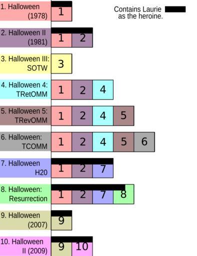 | Keywords: Halloween storyline continuity histogram by film.svg en A Histogram of the Halloween storyline continuity own The LMOE 2010-08-28 Instructions Generated in gnuplot with the following script set term svg set out test svg set title Halloween storyline continuity by film rotate by 90 unset ytics unset key set boxwidth 0 75 absolute set border 3 front linetype -1 linewidth 1 000 set style fill solid 10 00 border -1 set style histogram rowstacked title offset character 0 0 0 set style data histograms set xtics border in scale 0 0 5 nomirror rotate by 90 offset character 0 0 0 set yrange 0 00000 7 noreverse nowriteback plot 'data dat' using 2 using 3 t 2 Halloween II 1981 using 4 t 3 Halloween III Season of the Witch using 5 t 4 Halloween 4 The Return of Michael Myers using 6 t 5 Halloween 5 The Revenge of Michael Myers using 7 t 6 Halloween The Curse of Michael Myers using 8 t 7 Halloween H20 20 Years Later using 9 t 8 Halloween Resurrection using 10 t 9 Halloween 2007 using 11 xtic 1 t 10 Halloween II 2009 and data file data dat 1 2 3 4 5 6 7 8 9 10 1 Halloween \n 1978 1 0 0 0 0 0 0 0 0 0 2 Halloween II\n 1981 1 1 0 0 0 0 0 0 0 0 3 HalloweenIII\n SOTW 0 0 1 0 0 0 0 0 0 0 4 Halloween 4 \nTRetOMM 1 1 0 1 0 0 0 0 0 0 5 Halloween 5 \nTRevOMM 1 1 0 1 1 0 0 0 0 0 6 Halloween \nTCOMM 1 1 0 1 1 1 0 0 0 0 7 Halloween \nH20 1 1 0 0 0 0 1 0 0 0 8 Halloween \nResurrection 1 1 0 0 0 0 1 1 0 0 9 Halloween \n 2007 0 0 0 0 0 0 0 0 1 0 10 Halloween\nII 2009 0 0 0 0 0 0 0 0 1 1 Then a lot of editing in inkscape unfortunately Now rotate the image 90 degrees Halloween franchise |