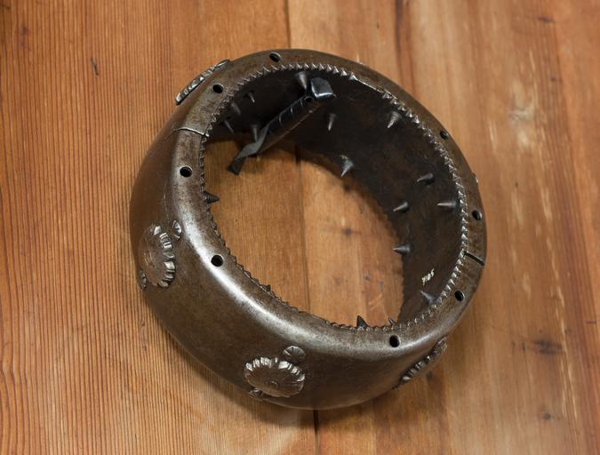 Keywords: Halsring med taggar. Tortyrredskap - Skoklosters slott - 108895.tif LSH artwork sv Halsring av stål svartmålad Bestående av två halvor förenade genom gångjärn Vertikalt genom kragen är åtta hål borrade Någon slags nyckel eller järnten har ursprungligen tillhört kragen - låsanordningen öppnas då man trycker med någon syl i hålet närmast Invändigt är kragen försedd med 18 fastlödda taggar + 4 på vardera kraghalvan grupperade två och två intill kragens skarvar vilka kan tryckas in och hållas i detta läge genom att en ten stickes ner i närmaste hål På kragens utsida sex nitar med stora uddiga huvuden varje sådan nit omgiven av två mindre Insidan med en tandad kant upptill och nertill <br/>Enligt 1710 års inventarium p 72 rum III 1 Tursk Halsband af Jern med taggar inuthi som de bruka på Christna fångar original caption Halsring med taggar Tortyrredskap Turkisk krage <br/> Nyckelord Krage Föremålsbild Våld Kragar steel size mm 160 58 SKO place of origin original filename sm_dig5953 27219 inventory number SKO 7105 108895 CC-BY-SA Fredrik Andersson Collars Fredrik Andersson Media contributed by LSH unmatched keyword Media contributed by LSH 2016-05 |