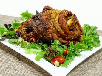 Keywords: ham hock pork knuckle roasted meat leg german food vegetables tomatoes crispy cuisine