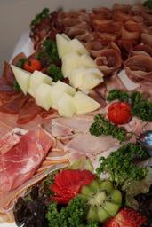 Keywords: ham plate ham cold buffet buffet eat food gourmet gastronomy frisch strawberries kiwi parsley