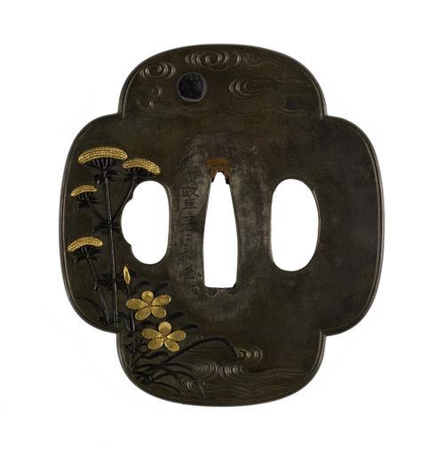MAKE A MEME View Large Image Hamano Harutoshi - Tsuba with Autumn Flowers - Walters 51127 - Back.jpg This tsuba shows the moon with seasonal flowers Beneath a full moon on the front are golden lace ominaeshi and bush clover hagi On the back pampas grass susuki and ...