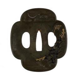 Keywords: Hamano Harutoshi - Tsuba with Autumn Flowers - Walters 51127.jpg This tsuba shows the moon with seasonal flowers Beneath a full moon on the front are golden lace ominaeshi and bush clover hagi On the back pampas grass susuki and dianthus nadeshiko are depicted beneath a crescent moon Golden lace and bush clover are both indicative of autumn Pampas grass is also a sign of autumn while dianthus is a summer flower With this combination of flowers and a crescent rather than full moon the back of the tsuba seems to be invoking the seasonal change from summer to autumn ca 1850 late Edo silver alloy with silver gold-copper gold and silver-gold cm 7 2 accession number 51 127 39526 Henry Walters Baltimore date and mode of acquisition unknown Walters Art Museum Henry Walters Acquired by Henry Walters Signature Hamano Harutoshi kao place of origin Edo present-day Toyko Japan Walters Art Museum license Tsuba in the Walters Art Museum Hamano Harutoshi Media contributed by the Walters Art Museum needs category review