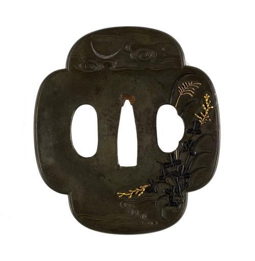 MAKE A MEME View Large Image Hamano Harutoshi - Tsuba with Autumn Flowers - Walters 51127.jpg This tsuba shows the moon with seasonal flowers Beneath a full moon on the front are golden lace ominaeshi and bush clover hagi On the back pampas grass susuki and dianthus ...