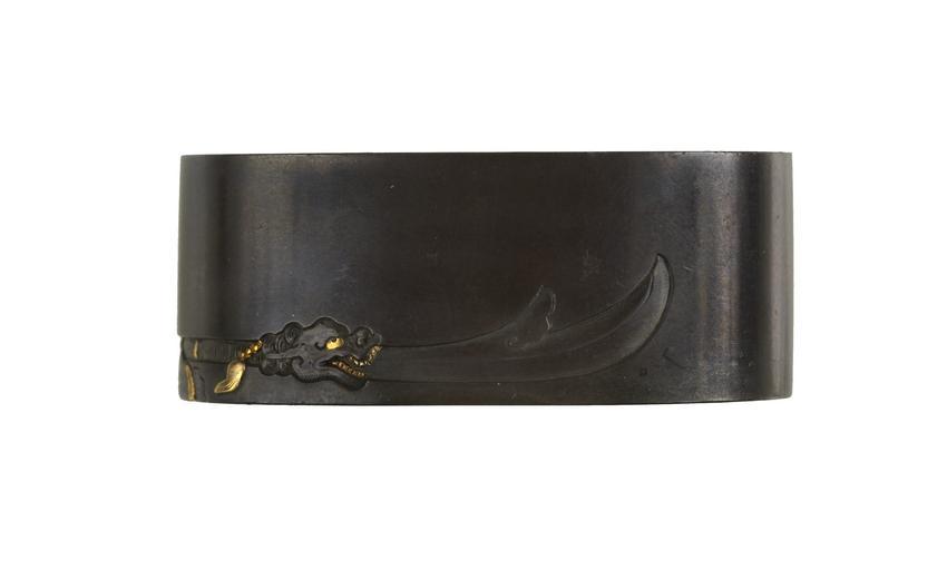 Keywords: Hamano Naohide - Fuchi with the Chinese General Kanyu - Walters 511068 - Back.jpg This is the 2nd-century Chinese general Kanyu Ch Guan Yu Kuan Yu Stories of his activities during the Three Kingdoms period are told in the 14th-century novel Romance of the Three Kingdoms He is recognizable by his long black beard A scroll is on the desk before him and his halberd is on the reverse This is part of a set with Walters 51 1069 1st half Other date century 19 late Edo shibuichi nigurome copper gold cm 3 7 l accession number 51 1068 29916 William T / Henry Walters Collection Baltimore date and mode of acquisition unknown Walters Art Museum Henry Walters Acquired by William T or Henry Walters Signature Hamano Naohide kakihan ; Number In pencil 826 6 place of origin Takata Japan Walters Art Museum license Fuchi in the Walters Art Museum Hamano Naohide Media contributed by the Walters Art Museum needs category review Guan dao |