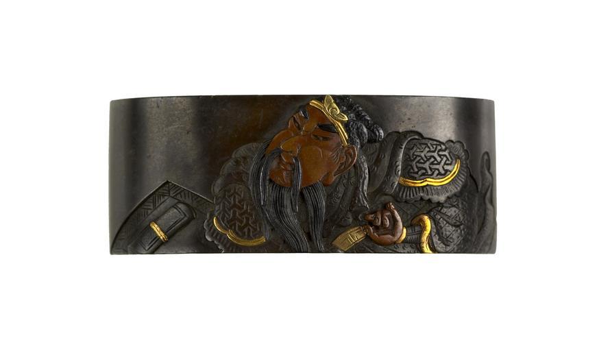 Keywords: Hamano Naohide - Fuchi with the Chinese General Kanyu - Walters 511068.jpg This is the 2nd-century Chinese general Kanyu Ch Guan Yu Kuan Yu Stories of his activities during the Three Kingdoms period are told in the 14th-century novel Romance of the Three Kingdoms He is recognizable by his long black beard A scroll is on the desk before him and his halberd is on the reverse This is part of a set with Walters 51 1069 1st half Other date century 19 late Edo shibuichi nigurome copper gold cm 3 7 l accession number 51 1068 29916 William T / Henry Walters Collection Baltimore date and mode of acquisition unknown Walters Art Museum Henry Walters Acquired by William T or Henry Walters Signature Hamano Naohide kakihan ; Number In pencil 826 6 place of origin Takata Japan Walters Art Museum license Fuchi in the Walters Art Museum Hamano Naohide Media contributed by the Walters Art Museum needs category review Guan Yu |