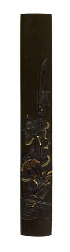 Keywords: Hamano Naoyuki - Kozuka with Kanyu at a Reading Table - Walters 51646.jpg This kozuka shows the 2nd-century Chinese general Kanyu Ch Guan Yu Kuan Yu seated at a desk reading Stories of his activities during the Three Kingdoms period are told in the 14th-century novel Romance of the Three Kingdoms He is recognizable by his long black beard The man behind him is probably his chief retainer Zhou Cang Chow Ts'ang between 1773 1829 late Edo nigurome gold and copper details cm 10 1 l accession number 51 646 32798 Henry Walters Baltimore date and mode of acquisition unknown Walters Art Museum Henry Walters Acquired by Henry Walters Signature Hamano Naoyuki place of origin Edo present-day Tokyo Japan Walters Art Museum license Kozuka in the Walters Art Museum Hamano Naoyuki Media contributed by the Walters Art Museum needs category review Guan Yu |