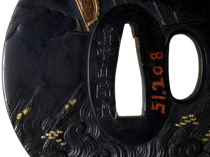 Keywords: Hamano Naoyuki - Tsuba with a Kuanyu Preparing to Throw a Spear - Walters 51208 - Mark.jpg The mounted figure along the right edge of this tsuba is 2nd century Chinese general Kanyu Ch Guan Yu Kuan Yu Stories of his activities during the Three Kingdoms period are told in the 14th century novel Romance of the Three Kingdoms Kuanyu is about to plunge his spear into the water Waves fill the lower section of both sides of the tsuba On the reverse the spears and battle flag of a army appear above the waves between 1773 1829 late Edo shakudo details in gold cm 7 2 6 7 0 35 accession number 51 208 11048 Henry Walters Baltimore date and mode of acquisition unknown Walters Art Museum Henry Walters Acquired by Henry Walters Signature Hamano Naoyuki place of origin Edo present-day Tokyo Japan Walters Art Museum license Tsuba in the Walters Art Museum Hamano Naoyuki Media contributed by the Walters Art Museum needs category review |