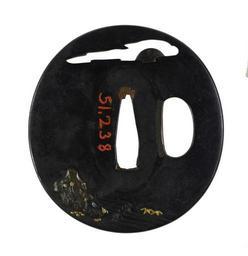 | Keywords: Hamano Shôzui - Tsuba with an Owl on a Stone Lantern - Walters 51238 - Back.jpg Across the top of this tsuba an openwork area forms clouds with the moon on the left On the right an owl sits on a stone garden lantern under a tree Bamboo and other plants surround the owl On the reverse are reeds and a stream between 1696 1769 Edo shibuichi gold cm 6 36 6 0 38 accession number 51 238 27301 Henry Walters Baltimore date and mode of acquisition unknown Walters Art Museum Henry Walters Acquired by Henry Walters Signature Shôzui place of origin Edo present-day Tokyo Japan Walters Art Museum license Tsuba in the Walters Art Museum Hamano Shôzui Media contributed by the Walters Art Museum needs category review |