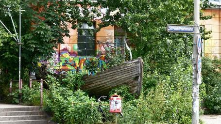 Keywords: hamburg boot old lapsed wooden boat home road street sign