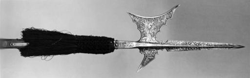 Keywords: Hans Stromai of Augsburg - Halberd for the Guard of Emperor Maximilian II - Walters 511323.jpg The blade is etched with plant designs surrounding the crowned double-headed eagle of the Holy Roman Empire the collar of the Order of the Golden Fleece a military order established by the dukes of Burgundy revered ancestors of the Habsburgs and the Latin motto The Lord will provide This halberd dated 1571 is one of those produced for members of the imperial bodyguard on the occasion of the wedding of Archduke Karl II of Austria brother of Emperor Maximilian II and uncle of Archduke Albert 1571 steel copper alloy; wooden staff and fabric are replacements cm 229 9 accession number 51 1323 13928 Guard of Emperor Maximilian II 1527-1576 Haden Sale April 26 1911 no 249 Sale American Art Association New York November 14 1921 no 103 Henry Walters Baltimore 1921 mode of acquisition unknown Walters Art Museum Henry Walters Acquired by Henry Walters 1921 Transcription The Lord will provide place of origin Augsburg Germany Walters Art Museum license Weapons in the Walters Art Museum Baroque art in the Walters Art Museum Renaissance applied arts in the Walters Art Museum Media contributed by the Walters Art Museum needs artist review Halberds Renaissance weapons |